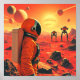 Um astronauta solitário está sobre uma paisagem de alienígena rochosa, mirando em uma enorme estrutura robótica com uma cúpula clara e pernas mecânicas. Vários planetas são visíveis no céu, criando uma cena marcante de exploração espacial.
