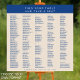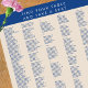 Simples de personalizar, este poster de tabela de assentos de convidados Marselha Bleu 300 pode acomodar sua recepção de casamento de até 300 convidados e você pode escolher seu próprio formato, de alfabético a mesa. Esse plano minimalista de mesa de poster de casamento se presta bem aos temas de casamento ultra modernos, assim como aos casamentos e eventos mais casuais, do profundo cabeçalho azul marinho no topo, que leva a cinco colunas de texto azul escuro sobre o fundo da nave. Cada uma das 5 colunas tem 60 linhas cada de modo que se você optar por criar o gráfico do plano de mesa alfabeticamente sem quebras de linha, você poderá ajustado 300 convidados de casamento. Se você preferir espaços entre grupos de letras, com ou sem cabeçalhos, isso certamente diminuirá a contagem de convidados. Com esta opção, escolha o seu próprio formato de design de assentos de casamento, você pode decidir organizar o gráfico de recepção por números de tabela para mesas que sentem 6, 8 ou 12 convidados, assim como os 10 típicos e pode até combinar tamanhos de mesa se for isso que o seu local oferece. A paleta de cores clássica do azul marinho, combinada com uma sonda suave, é uma escolha fácil para todas as estações, do outono e inverno até primavera e casamentos de verão. Personalize este poster de assentos de casamento personalizado de Marselha Bleu para sua recepção de casamento de 300 pessoas ou outro evento especial para que seus convidados possam se sentar facilmente.