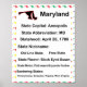 Um poster educacional divertido sobre o estado de Maryland nos EUA. Os fatos incluem o capital estatal, a abreviatura estatal, o apelido estatal, o estado, a flor do estado, o lema estatal e os estados limítrofes.