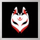 Máscara de raposa vermelha, preta e branca estilizada inspirada pela máscara tradicional japonesa.
