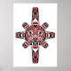 Este design de sol inspirado por Haida apresenta uma máscara estilizada no centro da estrela. Oito raios estilizados saem do meio do sol criando um padrão simétrico. Duas mãos caem logo abaixo da boca cheia de dentes, o que dá a este padrão nativo um olhar agressivo e na moda. Este na moda é um gráfico impressionante inspirado pela arte do Haida.