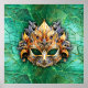 Uma máscara de belo ornamentado com ouro intrincado e embelezamentos prateados é colocada contra um fundo verde luminoso e flagrante, rachado, dando-lhe uma aparência elegante e misteriosa. A design apresenta caracóis elaborados e padrões semelhantes a folhas, acrescentando a sua estética real.