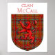 McCall Scottish tartan plaid pattern design for the McCall Clan Family underneath the red Lion Rampant Shield of Scotland.