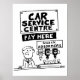 Cartoon de garagem engraçado. Centro de Serviços Automóveis de uma empresa de reparação de automóveis, reparação de automóveis e mecânica de veículos. Ótima ilustração de desenho animado de um mecânico atrás da mesa pronto para receber o pagamento. Há bebidas alcoólicas em ótica sob um cartaz que diz "Absorventes de Choque". Presente para garagem ou mecânico de carro.