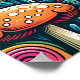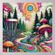 Um campo de golfe colorido único em um campo de cogumelos retrorreflectores, pinheiros, nuvens giratórias coloridas, luz do sol em cores antigas como azul, verde, rosa e laranja.
