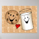 Cartoon festivo divertido de um copo alto de leite branco com uma face feliz de sorriso, e um biscoito gostoso de chocolate com chip. Ambos estão sorrindo, com um coração vermelho no meio. Esquema de cores castanho-escuro e claro com padrões e cores divertidas. Esta design está disponível em várias seleções de produtos diferentes.