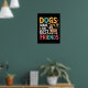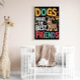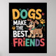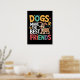 Este gráfico animador mostra um filhote de desenho animado alegre, marrom-claro, com uma expressão feliz e uma língua esticada, sentada contente. O texto preto e multicolorido em várias fontes declara "CÃES FAZEM OS MELHORES AMIGOS", acentuado por impressões coloridas em amarelo, azul e rosa. O design é colocado contra um fundo preto sólido, fazer a mensagem vibrante pop. Download digital apenas para uso pessoal.