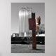 Visualização única de um Memorial das Torres Gêmeas a preto e branco com uma peça real do edifício em primeiro plano a cores. Excelente para casa ou escritório.