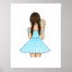 Menina jovem segurando um pequeno coelho marrom-creme em seus braços e ombros. A menina está vestindo um lindo vestido de primavera xadrez gingham azul pastel. Um design adorável para decorar abril e berçários. Design ideal para o quarto de uma menina.