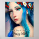Sonhe grande e viva sua citação da Fada. Bonito fada encantada com cabelo azul e flores vermelhas e brancas em seu cabelo e olhos azuis. Fantasy art ai art. conteúdo generativo