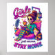Design vibrante e colorido com um esqueleto feminino sentado numa cadeira confortável com seu gato, lendo um livro e segurando uma xícara de café. O texto colorido diz: "Meninas só querem ficar em casa". Esse design está disponível em uma grande variedade de produtos.