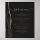 Um sinal elegante para o seu menu de bar de casamento. As palavras "menu bar" aparecem na caligrafia dourada com hastes no início e no fim, com texto personalizável abaixo. Uma aquarela preta agata design aparada com brilho dourado faux decora a borda esquerda em um fundo preto ardente. Veja a nossa coleção para o convite de casamento e o diário de papelaria.