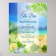 Mostre seu cardápio de bar aberto para o casamento na praia com um design brilhante e alegre que apresenta uma praia ouro com o mar turquesa e o céu azul com luzes bokeh, decorado por um copo claro de vinho com uvas e um copo refrescante de mojito gelado com menta e limão sobre folhas frescas de palmeiras verdes. Perfeito para casamentos de praia, casamentos de destino, casamentos tropicais, casamentos insulares, casamentos de Verão e outros eventos relacionados com o mar. Visite a coleção para ver a suíte inteira.