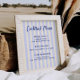 Placa de menu de coquetel de despedida de solteira com tema mediterrâneo fantástico, apresentando uma paleta de cores suaves e convidativas de creme e listras azuis suaves. Esse pano de fundo tranquilo é perfeitamente complementado pela fonte escrita à mão azul escura e divertida, criando uma mistura harmoniosa de cores.