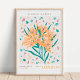 Um design refinado e dinâmico que combina ilustrações botânicas inglesas vintage com uma estética minimalista moderna. Esta ilustração apresenta um impressionante buquê de lírios em tons suaves de damasco e creme, acentuados por uma dança rítmica de folhas em tons de azul-teal e terracota contra um fundo neutro e quente.