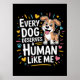 Este gráfico encantador apresenta um cão de desenho animado feliz, marrom-claro e branco com olhos expressivos e uma expressão feliz e aberta. O texto, em fontes lúdicas e multicoloridas (laranja, amarelo, azul, vermelho) declara, "CADA CACHORRO MERECE UM HUMANO COMO EU", apresentando um ícone de osso e sotaques de estouro. Esta design celebra a posse responsável e amorosa de cães contra um sólido fundo negro. Download digital apenas para uso pessoal.