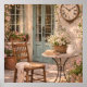 Traga a calidez e o romance do campo francês para dentro da sua casa com esta serena arte de parede de pátio. Uma mesa rústica de pedra posta com um livro aberto, café fresco e delicadas flores fica ao lado de uma encantadora cadeira de madeira coberta com um suave cobertor de linho. A luz do sol brilha através de portas francesas vintage adornadas com uma coroa de lavanda, enquanto rosas trepadeiras e um relógio antigo pendurado completam a cena tranquila de jardim. Perfeita para cozinhas rústicas, cantos aconchegantes para leitura, interiores de casas de campo e decoração de estilo francês.