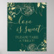 Este design de pôster apresenta peônias e folhagens douradas falsas em um estilo de desenho de linha minimalista moderno em um fundo sólido. "O Amor é Doce, Por Favor, Pegue um Tratamento!" apresenta uma tipografia cursiva manuscrita em dourado correspondente. Este sinal é a maneira perfeita de informar aos convidados do casamento ou chá de bebê onde pegar seus doces.