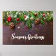Um poster com uma fotografia rústica de uma mesa marrom de madeira com pinecones, agulhas de pinheiros, neve e Enfeites de natal. Festivo e adorável.
