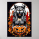 Sob o brilho prateado da lua, espera-se uma transformação cativante. Uma mulher lobisomem, envenenada e poderosa, está no meio do ambiente estranho. Antes dela, uma abóbora meticulosamente esculpida treme com uma luz de outro mundo. Este poster de Halloween captura a mística da noite, onde a linha entre o humano e a besta se abafa, e o encantamento se torna palco central.