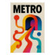 Trois lignes multicolores (jaune, rose, turquoise) convergent vers une arche de tunnel stylisée, faite de dégradés arc-en-ciel inversés. Les ronds évoquent les arrêts de métro mais aussi des bulles ou des symboles. La typographie METRO domine en noir massif, jouant le contraste avec le fond clair. Une affiche éclatante, légère, presque euphorique.