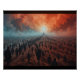 Uma representação fotorealista e abstrato da "migração climática" com inúmeras figuras pequenas, sombrias e indistintas — evocando movimento e anonimato, como folhas sopradas pelo vento ou tendrils de fumaça — fluindo unidirecionalmente através de uma vasta paisagem. Estes números afastam-se de uma "zona inabitável" distante, ferozmente vermelha, queimada pelo calor e devastada por tempestades, em direção a uma "zona de refúgio potencial" pouco escura, mais fria, azul claro, que parece estar cada vez mais lotada e sutilmente fortificada com fronteiras de abstrato. A jornada através do terreno estéril e surreal simboliza uma migração árdua em meio à catástrofe climática, misturando a paisagem da abstrato com um senso de desespero e esperança.