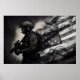 A striking black and white smoke ink wall art design honoring the strength, discipline, and sacrifice of our United States military troops. This powerful artwork features a soldier in profile pressing forward towards his mission with an American flag materializing and emanating from behind him in smokey, ink-like, cinematic artist effects, creating a bold and emotional statement piece that pays tribute to our service members both past and present.