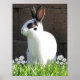 Mini rex no nosso quintal com margaridas olhando ao redor ao sol da manhã. Foto de Carolyn Hidalgo
