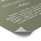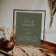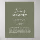 Este cartaz memorial minimalista de folha verde escura em memória é perfeito para um casamento elegante. O design apresenta uma silhueta de folha de verde simples em verde oliva com estilo boêmio montanhês minimalista.