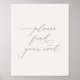 Elegant minimalist “Please find your seat” wedding sign designed in a soft sage green and ivory color palette.