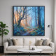 Artwork of a misty forest with sun rays lighting the path with dappled light. A mysterious forest path winding through tall, ancient trees. This art features a dramatic contrast between cool blue fog and warm, golden sunlight illuminating the tree trunks and fern-covered ground. Ghostly blues and teals shroud the background trees, creating a sense of infinite depth and mystery. In the foreground, vibrant beams of amber light strike the mossy trunks and ferns, guiding the viewer’s eye down the path toward the unknown. Perfect for nature lovers or anyone who want to add some tranquil serenity into their home decor.