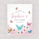 Este lindo, elegante, e sinal de boas-vindas giro-chá de fraldas apresenta um design de borboleta cor-de-água rosa mágico, com borboletas e flores, e pode ser personalizado com um nome e data em uma tipografia caprichosa. O perfeito design floral para o seu chá de fraldas.
