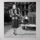 Foto da moda antiga dos anos 30 de uma linda mulher com casaco de pele, saia e carro velho e legal.