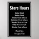 Há um texto de exibição branco que você pode substituir por uma mensagem personalizada e seu horário de funcionamento diário de domingo a sábado. Este horário de funcionamento é preto. O texto é branco. A borda no cartaz é branca. Todo o texto pode ser editado ou excluído. Na parte inferior, há mais texto de exibição para uma mensagem personalizada (mostrado: Obrigado pela sua visita)