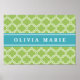 O azulejo marroquino moderno e ousado inspira o padrão de lattice trellis em verde e branco com um brilhante nome azul modelo.