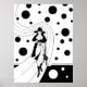 Ilustração Vintage arte deco design com uma moça de chico vestida de chapéu e casaco e carregando de bolsa. A mulher está caminhando por um caminho flutuante. Bolinhas, círculos ou bolhas pretas estão flutuando. O fundo está claro para que você possa adicionar qualquer cor que quiser! Clique no botão "personalizar"!