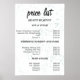 Dê à sua lista de serviços uma atualização rápida e atualizada com esta lista de preços manchada! Essa design combina elegância mínima com um sutil toque artístico, fazer ideal para salões que querem projetar um olhar limpo, moderno e convidativo. Organizado em seções — Cortar & Estilo, Maquiagem de Casamento e Cabelo, e Cor de Cabelo — o layout mantém as coisas claras e na moda com tipografia graciosa e uma dica de textura de menta macia no fundo. Perfeito para profissionais de beleza que amam uma vibração fresca e polida!