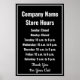 Há texto de exibição branco que você pode editar para adicionar o nome da sua empresa, uma mensagem personalizada e o horário comercial diário de domingo a sábado. Este horário comercial é preto. O texto é branco. A borda do cartaz é branca. Todo o texto pode ser editado ou excluído. Na parte inferior, há mais texto de exibição para uma mensagem personalizada (exibido: Obrigado pela sua visita)