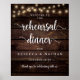 Pôster de Boas-vindas do Jantar de Rehearsal de Casamento em Moderno Rústico, com tema de madeira escura de casa de campo e luzes de corda.