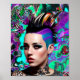 Mohawk punk, mulher-foguete com mohawk colorida, tatuagens e piercings e fundo de arte abstrato fluido em preto, roxo, verde e azul.