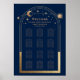 Mística Chic Blue Sun Moon Stars Astronomy Wedding Seating Chart Sinal Instant Download Digital Imintable Poster Impressões apresenta um sol dourado, lua e estrelas num fundo azul marinho escuro. Dentro o quadro é o texto "Bem-vindo" no elegante script de caligrafia dourada e as informações personalizadas do assento de casamento. Projetado para você por ©Evco Studio www.zazzle.com/store/evcostudio