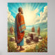 Este trabalho de arte cativante retrata o ato de fé de Abram no Gênesis 15, onde ele está diante de um altar de pedra sob um céu azul brilhante. Vestido em túnica vibrantes de vermelho, laranja e branco, o olhar de Abram para cima reflete sua firme crença na promessa de Deus. Ele se posiciona em um chão circular de rocha azulejo, rodeado de pedras rochosas, em meio a um cenário sereno de relva e colinas rolantes. A paisagem tranquila reforça o significado espiritual deste momento, criando um eterno e um tributo reverente a um dos principais acontecimentos da Bíblia.