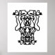 A black abstract squiggle design is centered on a white background, exhibiting a symmetrical pattern that could be interpreted in multiple ways depending on the viewer's perspective. The continuous line creates a harmonious balance and suggests a sort of mirrored effect.