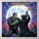 Frankenstein and the Grim Reaper are locked in a fierce battle under a dramatic, stormy sky. Lightning and the full moon illuminate the tense confrontation.