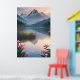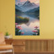 Uma pintura digital serena retrata um lago montanhoso tranquilo no pôr do sol. O primeiro plano apresenta uma pequena ilha com flores silvestres vibrantes em tons cor-de-rosa, amarelo e vermelho, enquanto o fundo apresenta uma montanha majestosa com picos de neve. O céu é pintado em tons suaves de rosa e laranja, refletindo na superfície calma do lago.