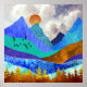 Este design esplêndido retrata uma paisagem colorido de montanha com céu nublado e colinas rolantes em texturas e cores arrojadas como azul, lacre, ciano, ouro e laranja.
