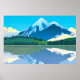 Poster num quadro digital de montanhas e florestas de pinheiros com capas de neve, refletido num lago, sob um céu azul profundo