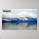 Uma pintura digital de montanhas com capas de neve nas margens do lago Pend Oreille (oray de lagoa) em Sandpoint, Idaho, no final do inverno. O texto "IDAHO" também é exibido.