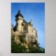 Poster impressão de andorinhas que voam em torno do castelo medieval Montfort construído nos penhascos calcários ao longo do rio Dordogne, Vitrac, França.