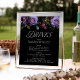 Elegante cartaz de cardápio de bebida floral apresentando uma borda superior de flores roxas e burgundy com folhas verdes e bagas escuras. O design floral roxo moderno é complementado pela tipografia caligráfica moderna. Personalize o cartaz da bebida do casamento com uma opção de bebida. O cartaz de menu de bebida floral gótica é perfeito para ser exibido no seu casamento outono, chá de panela, chá de fraldas, festa de aniversário ou evento especial. Projetado para coordenar com a nossa coleção de casamento Moody Gothic Floral.